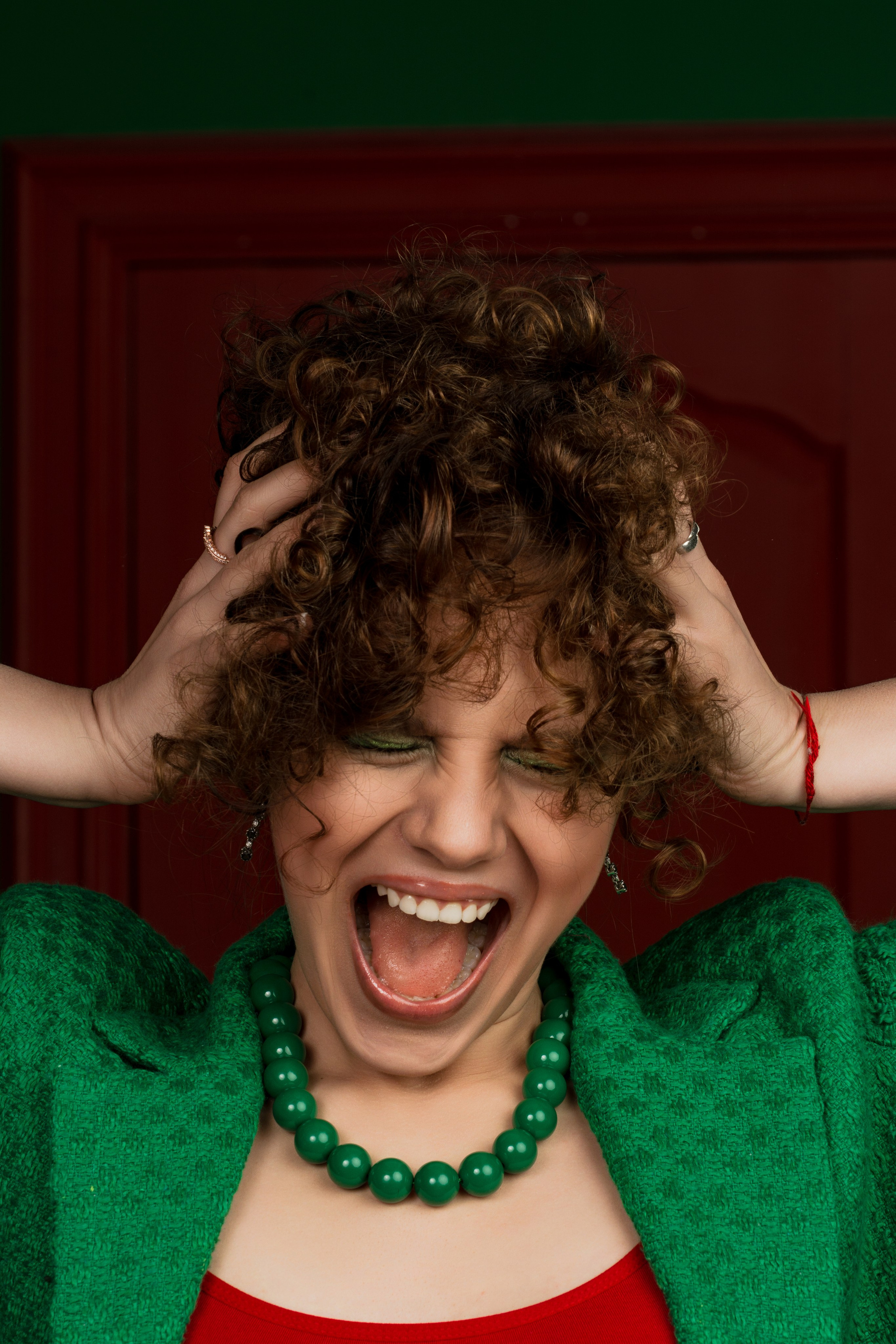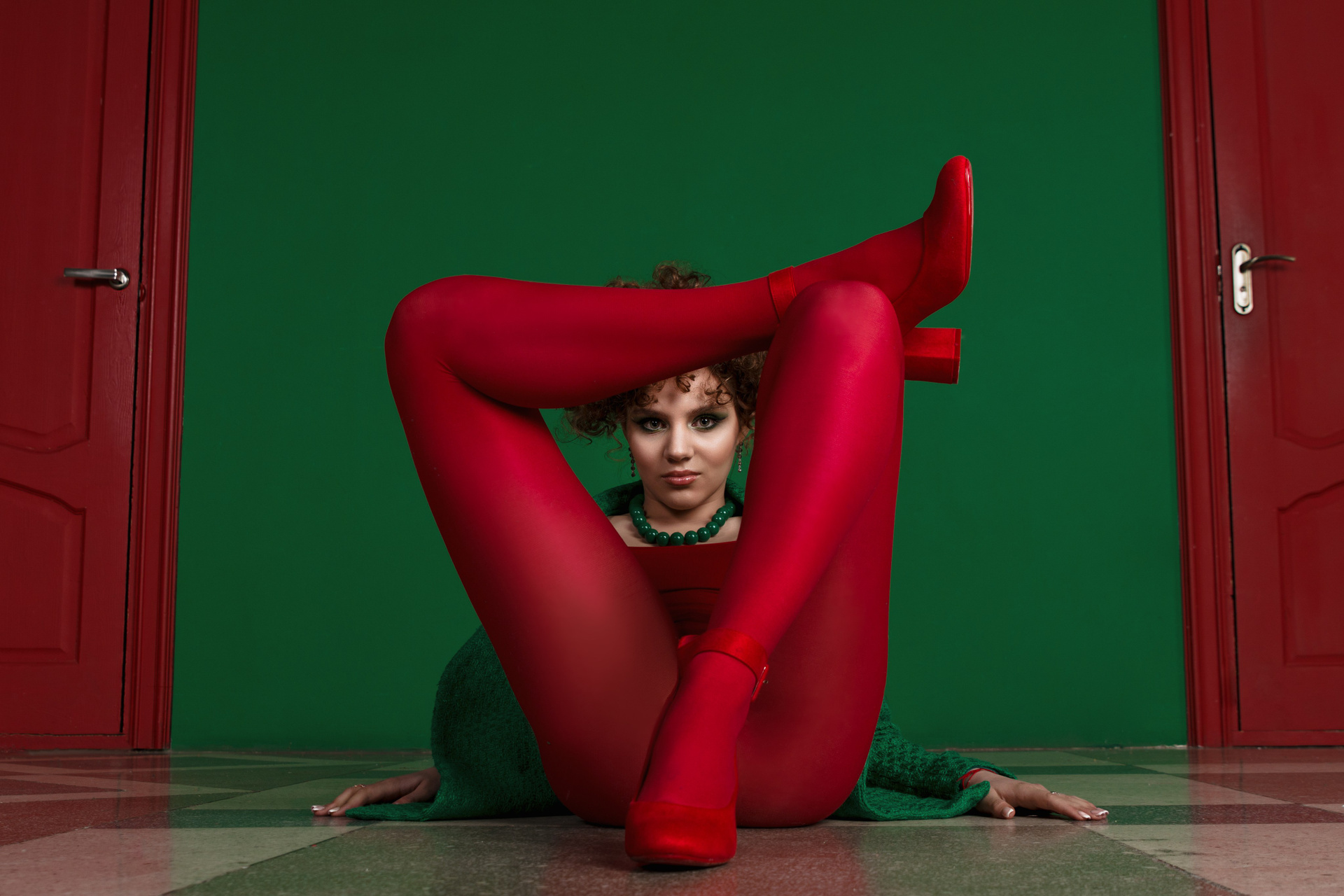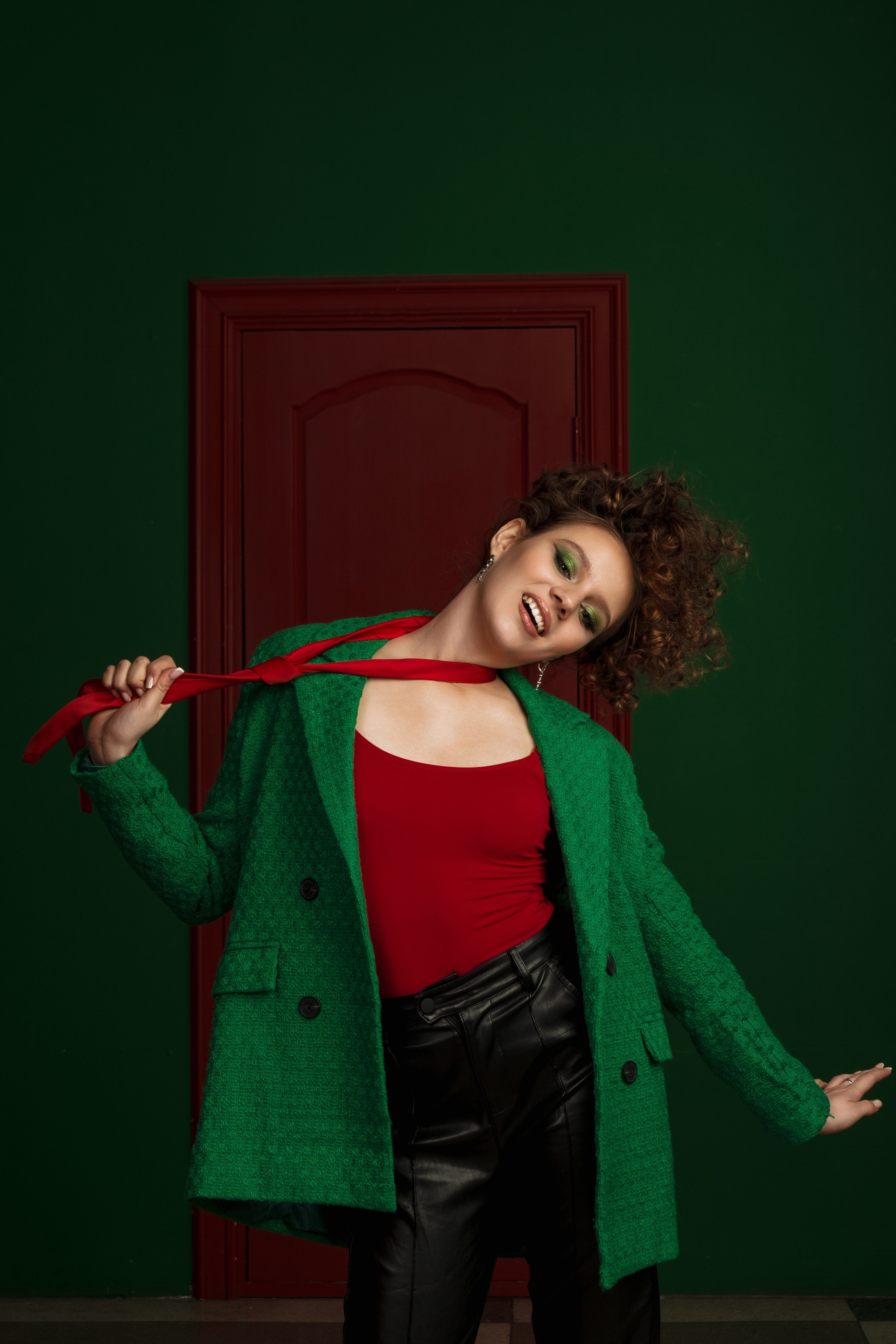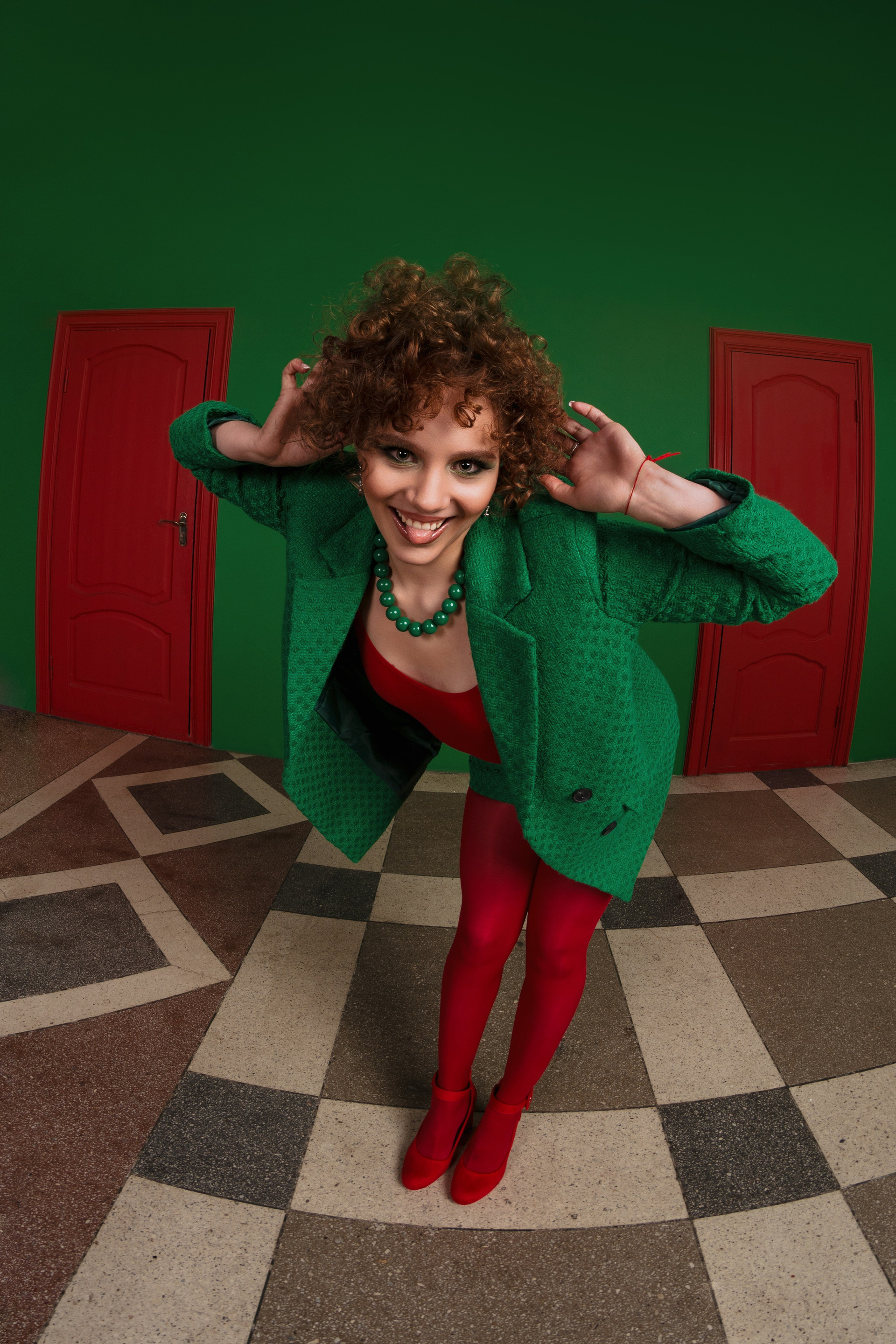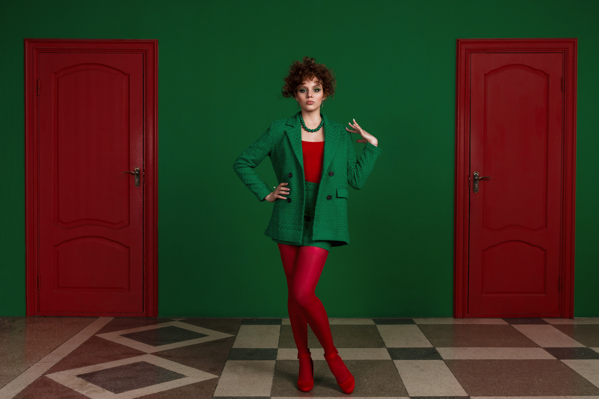 Изначально я предлагала более спокойное сочетание, но клиенту в них не доставало красок. В итоге была найдена студия с зеленой стеной и красными дверьми и в моем воображении родилась фотография стоящей между ними Насти, одетой в те же цвета. Мою идею поддержали и был выбран соответствующий лук, который я дополнила очками из своей съемочной коллекции.
